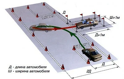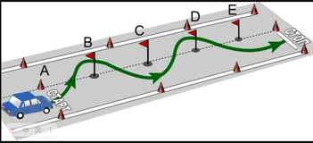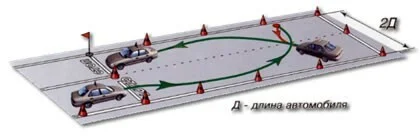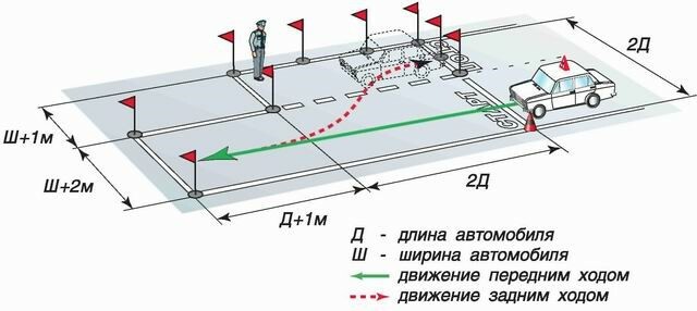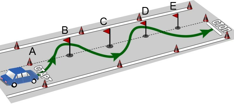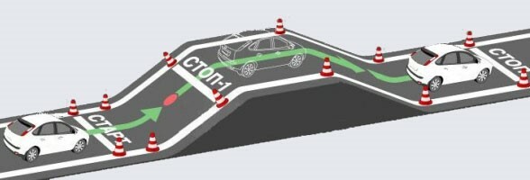 Упражнение «змейка» начинается от линии перед упражнением. После начала движения нужно проехать «слалом» между вешками, при этом нельзя выезжать за сплошные боковые линии и сбивать вешки.